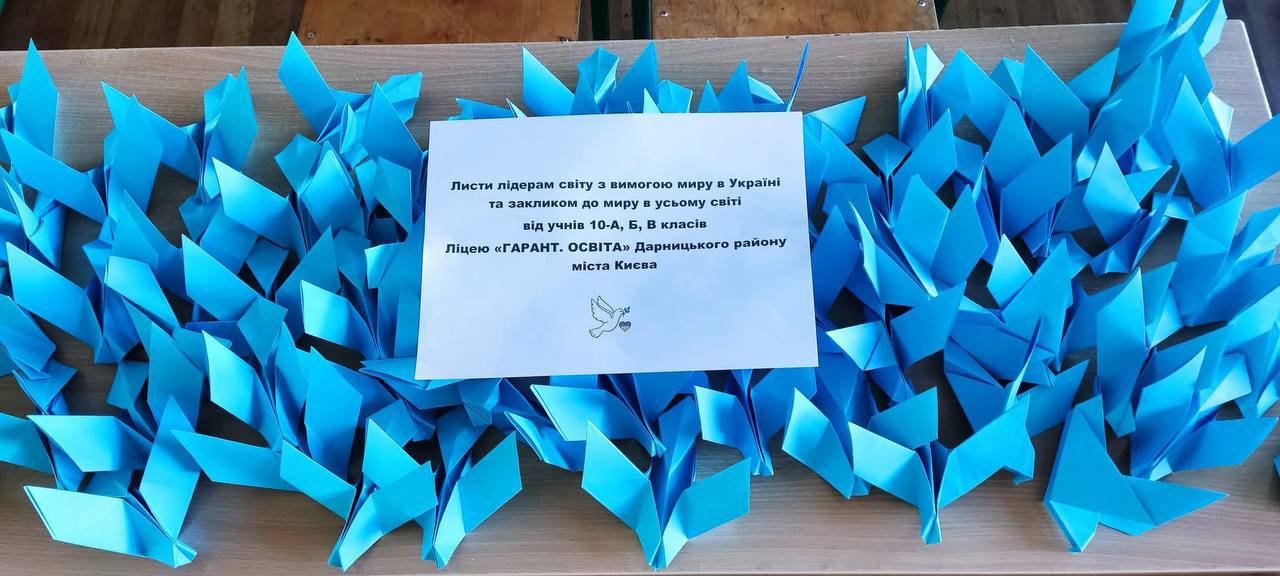 Учні виготовили голубів-оригамі з посланнями до світових лідерів з вимогою миру в Україні та закликом до миру в усьому світі.